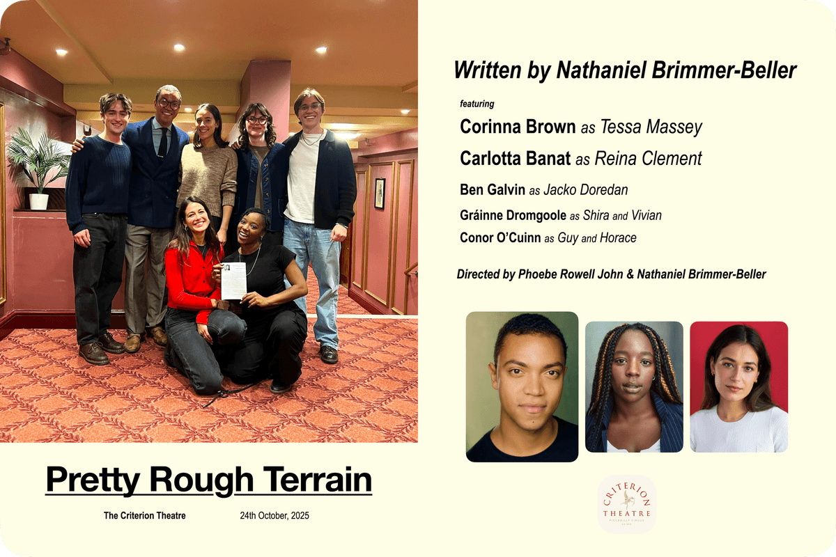 Nathaniel's latest play Pretty Rough Terrain was selected for the Criterion Theatre's New Writing Showcases, and had an extract read onstage in the West End in October 2025.